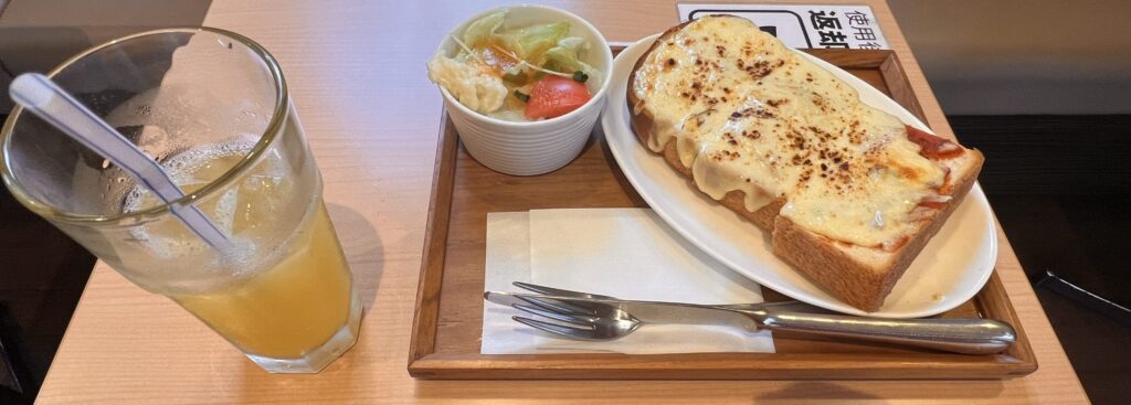 ピザトースト、ミニサラダ、ドリンクのランチセットで1350円