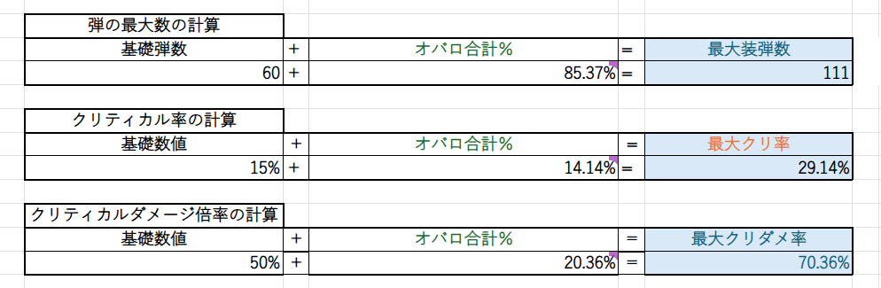 最大装弾数1ヶ所、クリティカル率2ヶ所、クリティカルダメージ1ヶ所をつけた結果がこれです。