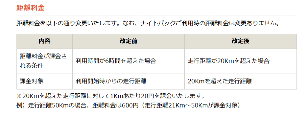 今まで6時間未満の利用だと時間料金の4290円だけだったのが20kmを超えると距離料金もかかってくるから改悪になるという話